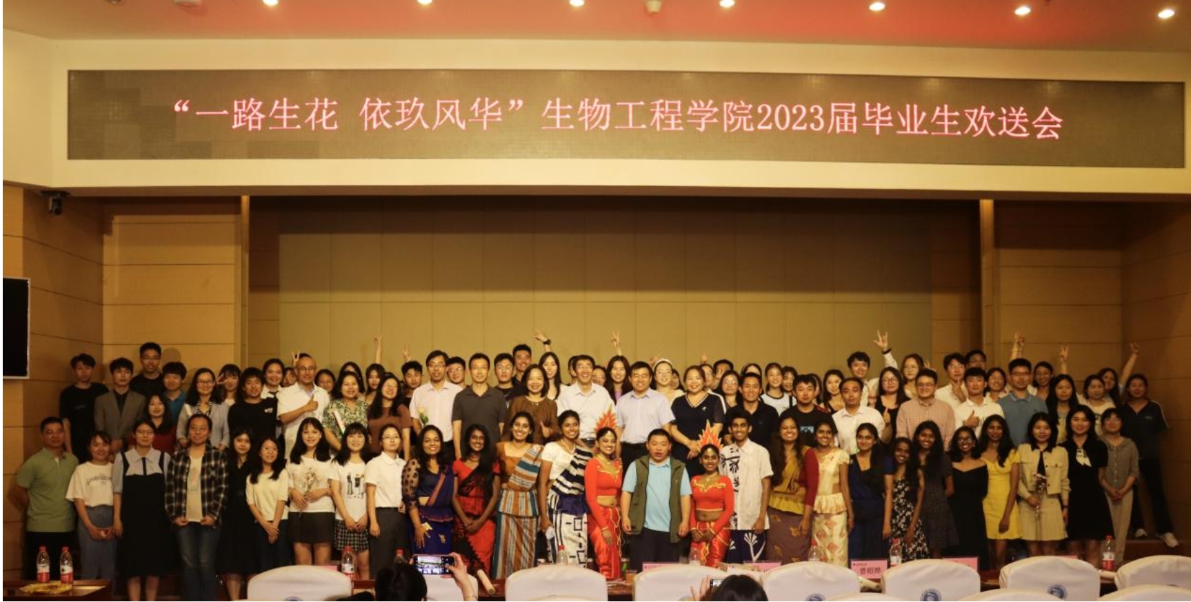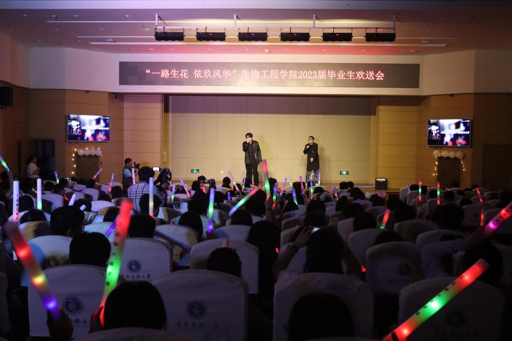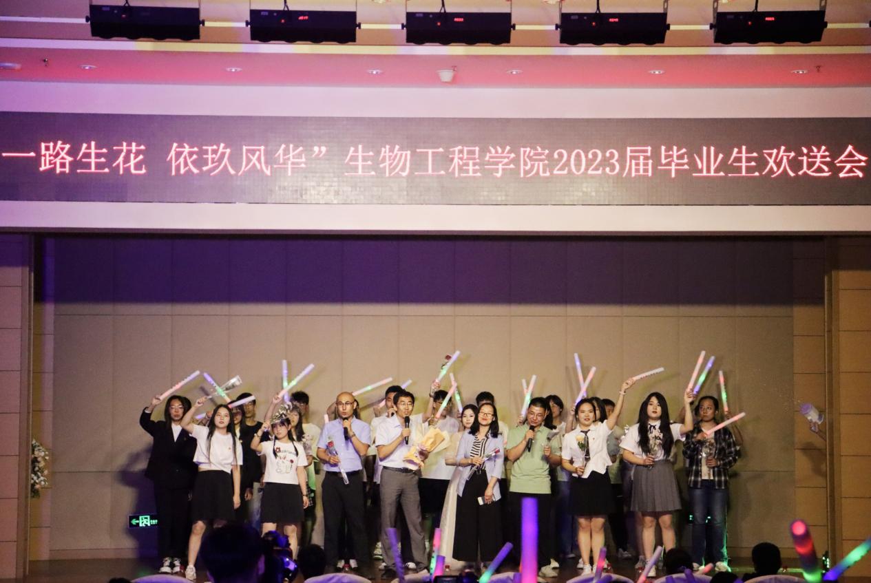 本届欢送会以“一路生花 依玖芳华”为主题,共分为“紫藤花下,少年笙歌”、“少年锦时,不负韶华”、“知命不惧,日日自新”和“星河为路,此去乘风”四个篇章。晚会伊始,播放由海角网领导老师送别2023届毕业生特别制作的寄语视频,老师们用谆谆教诲共同祝福学生们在人生新的征程上,保持前进,不负青春;一首《第一天》正式拉开晚会帷幕,唱响悦耳动听的青春旋律;《阿刁》歌声悠扬,小品《如此队友》和歌曲《不再犹豫》,展示着团队合作的重要性和生命活力,笛子串烧《不愁+无羁+青花瓷》勾起了大家对大学生活的无尽回忆,歌曲《心墙》、《海阔天空》、串烧《再见+放心去飞》再次点燃全场,响起雷鸣般的掌声,留学生歌舞节目《Srilankan cultural songs with traditional dance》更是惟妙惟肖,向大家表达了来自异乡的毕业祝福,全体辅导员老师带来的歌曲《明天会更好》将最真挚美好的祝福送给本届毕业生。整场晚会在190411班演唱的歌曲《这世界那么多人》中拉下帷幕。