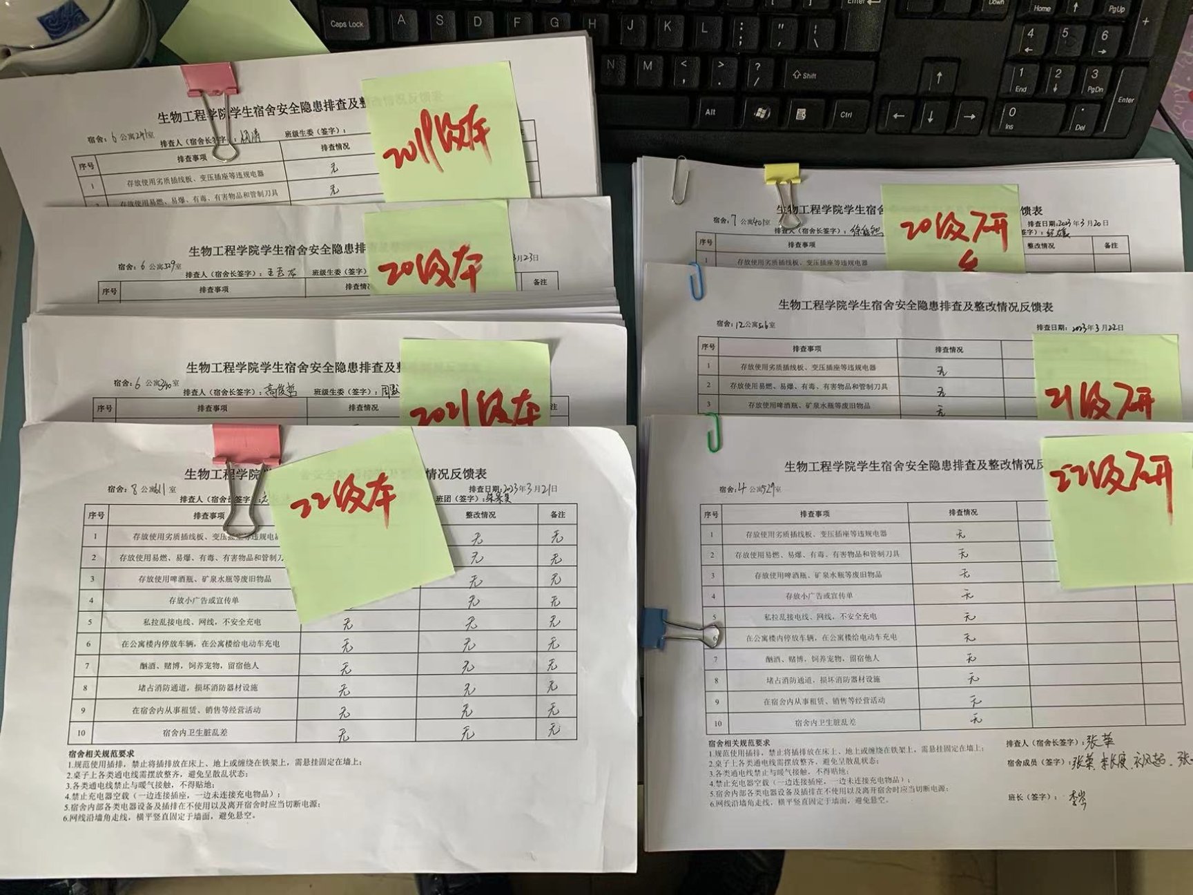关于开展学生宿舍安全隐患排查整治活动的通知》后,全体学生宿舍网格员(宿舍长)会同宿舍成员先行开展认真自查,签写《生物工程学学生宿舍安全隐患排查及整改情况反馈表》。