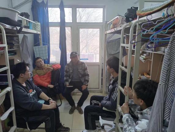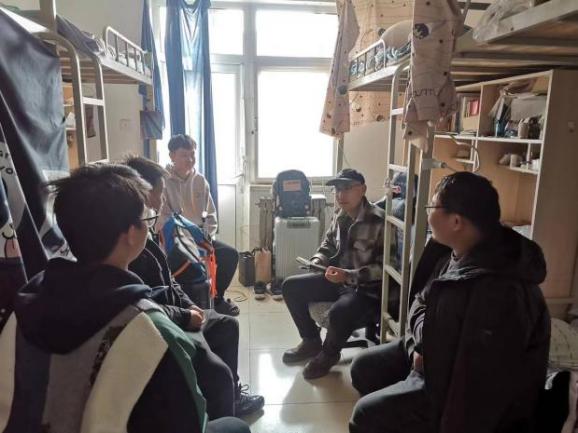 在走访宿舍过程中,田凯老师询问学生考研复试、毕业设计及求职出国等的情况,鼓励学生们克服懈怠积极备考和求职,引导同学们关注积极心理养成,学会自我调节。结合大四年级特点,田凯老师着重从校园常见传染病防治防控和关注个人健康管理、安全教育、学业和职业规划、预防电信诈骗、心理健康教育、诚信教育及资助管理等方面与同学们进行了交流。