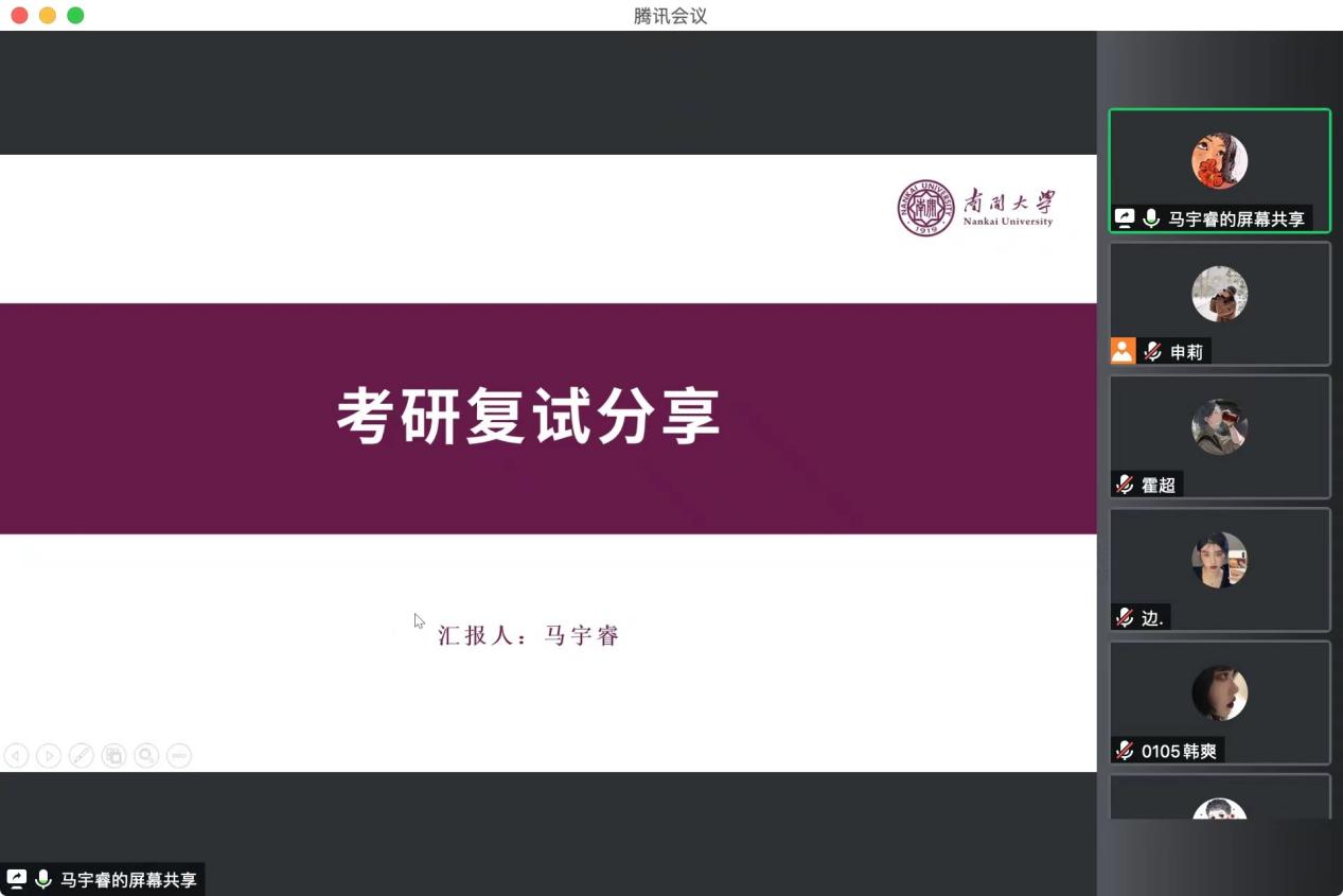 会议上,元跃同学从“自我认知”、“复试准备”以及“复试注意事项”三个方面详细讲解了天津大学考研复试所需要了解的内容和注意事项。马宇睿同学从“复试内容”和“复试注意事项”两个方向向同学们分享了报考天津南开大学的复试经验。李佩贤同学从“仪容仪表”、“线上复试”和“复试流程”三个方面向同学们详解了报考天津大学所需的复试经验。