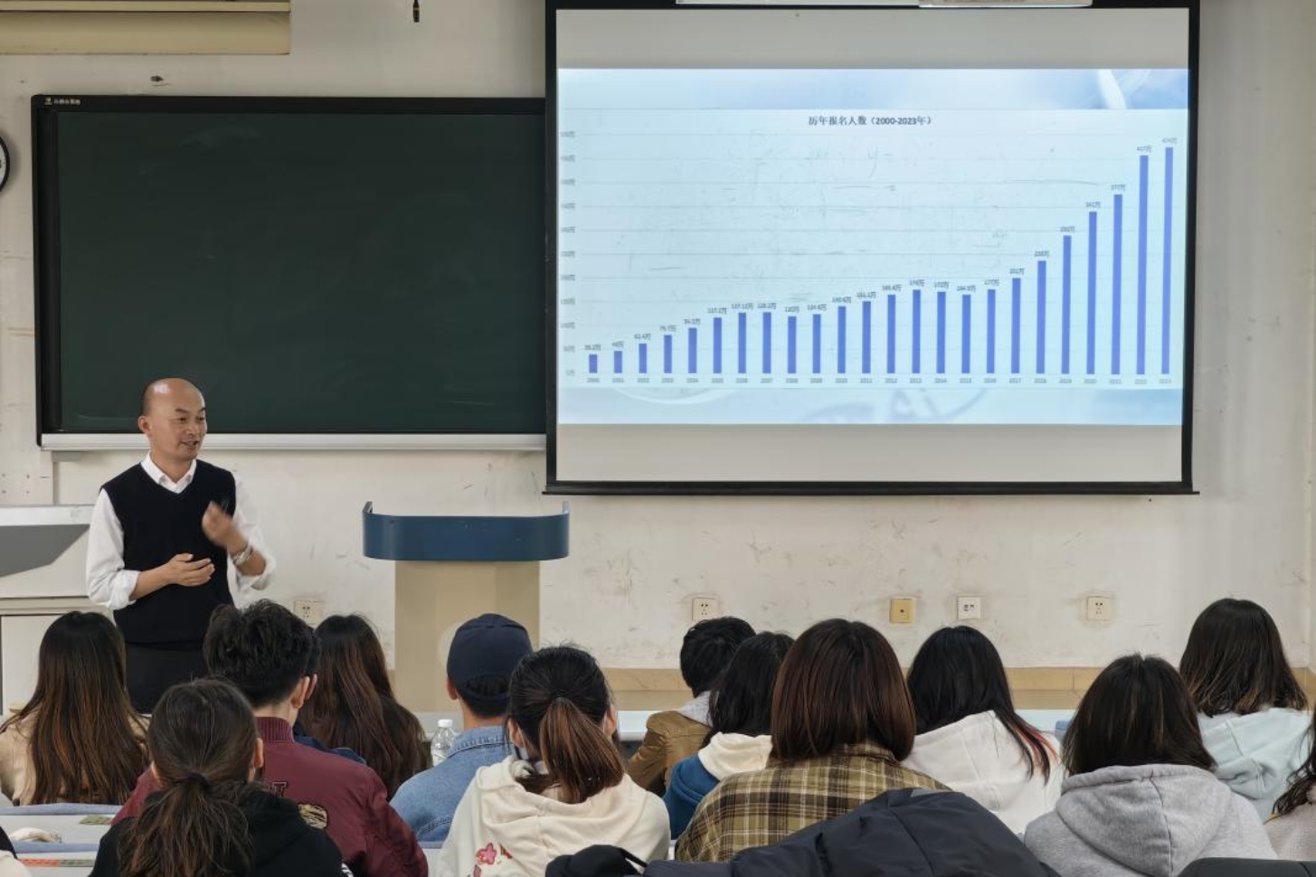 会上,张成林老师鼓励全体同学科学认识考研这件事情,并将科学思维贯穿考研过程始终。一是科学认识考研竞争偏差,围绕2000年以来的考研人数具体分析,介绍考研竞争逐年激烈的基本状况,解读考研的含义和考研的复杂性。二是科学规划考研的目标,围绕考研院校、专业的选择,是否选择跨考,选择研究所还是高校?等学生关注的问题逐一解答。三是科学谋划复习进度,强调专业课复习的重要性,给出英语课复习的技巧,建议同学们分科目分方法,横跨考研历程时间线进行整体的规划复习。四是科学选择导师方向,聚焦个人发展规划,是偏向于深入的理论研究还是投入到工作实践中,再行判断导师的研究方向与自我规划是否适恰。五是科学积蓄支持资源,要主动关注朋辈的经验引导,要注重建立伙伴的通力合作。最后,张成林教授热心的解答现场同学们提出的问题与疑虑。
