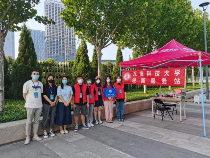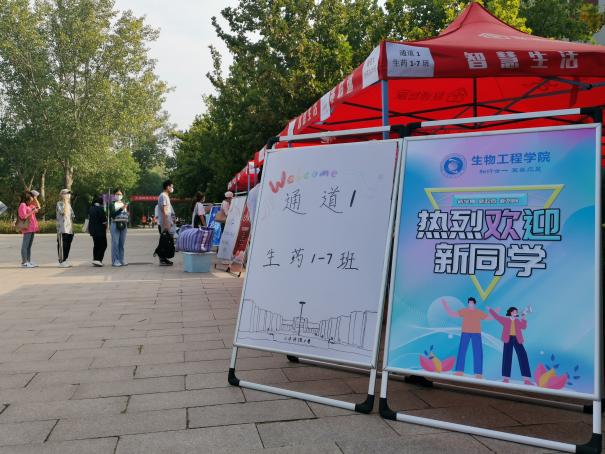 迎风飘扬的彩旗,远远地夹道欢迎前来报到的新生。从正门口的“天科青年 未来可期”、“喜迎二十大 筑梦向未来”