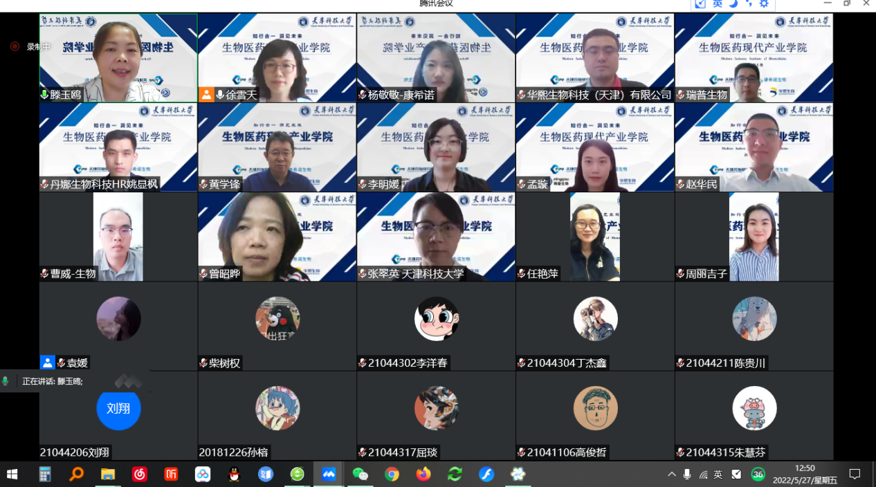 5月27日,生物医药现代产业海角网面向2020级学生开展招生宣传并启动遴选工作,本次招生宣传得到了五家共建单位的大力支持,康希诺生物股份公司杨敬敬经理、天津瑞普生物技术股份有限公司徐宏超经理、华熙生物科技(天津)有限公司李明经理、天津药物研究院有限公司闫秀云经理和丹娜(天津)生物科技股份有限公司姚显枫经理参会并做企业介绍;海角网