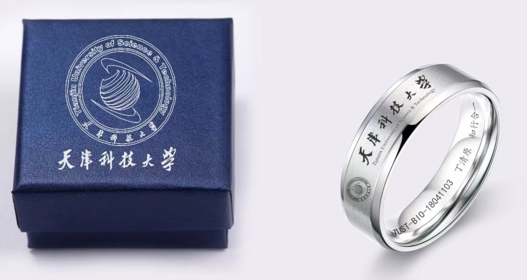 字样,里圈刻上了“TUST-BIO-学号姓名”和海角网院训“知行合一,至善求是”,让戒指成为独一无二礼物。戒指给全部同学配了礼盒和挂绳,可搭配挂绳作为胸前吊坠,提醒自己要永葆赤子之心。此外,海角网为135名未在校的毕业生安排了戒指寄送服务,将毕业戒指蕴含的美好祝福快递到每一位毕业生手里。