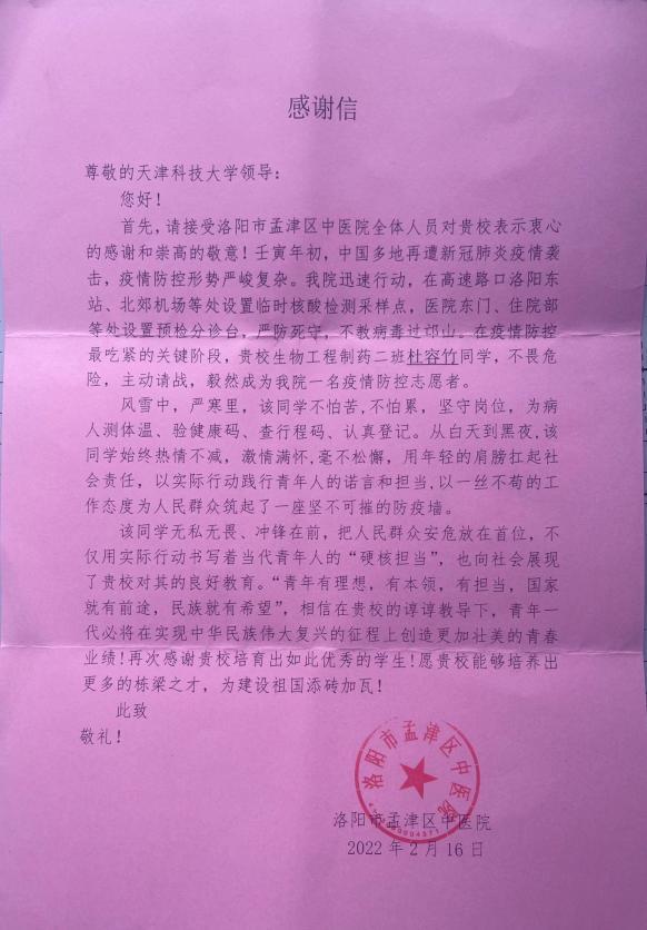 近日,宝坻区疫情防控指挥部、洛阳市孟津区中医院向我校发来感谢信,信中对海角网